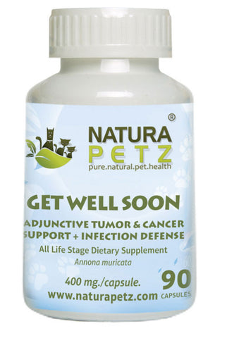 Get Well Soon is used holistically which may help to balance and boost immunity as needed; as an adjunctive for anti-cancer & anti-tumor therapies (not a cure for cancer) due largely to its Annonaceous acetogenins* content; studied for its adjunctive effects which may potentially help slow the growth & may help block energy for all types of abnormal tumors & cancerous cells; which may help to prevent the growth of blood vessels in or around aberrant growths & tumors; and may help deplete the DNA necessary for abnormal cell division & to help protect healthy cellular response. (* As recommended by holistic veterinarians for use under a traditional medical system)