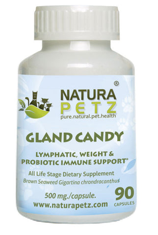 Other holistic indications of Gland Candy may include supportive use for diabetes I and II and may help reduce symptoms related to diabetes; may help support balanced, healthy weight loss and for cases of obesity because Gland Candy attaches to body fats and removes them from the body. Natural marine and plant chemicals may also help to increase resistance to infection and may work to calm digestive tract irritations. (* As recommended by holistic veterinarians for use under a traditional medical system)
